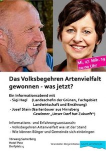 Die Bürgerinitiative „Zukunft Samerberg“ lädt ein zum Informationsabend “Artenschutz” am kommenden Mittwoch, den 27.3.2019 um 20 Uhr zur Post in Törwang. Die Einladung richtet sich an die gesamte Bevölkerung. Dazu sind zwei Experten eingeladen: