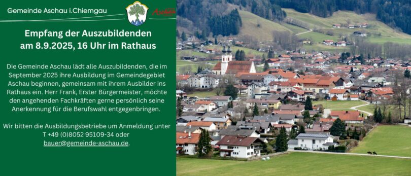 Die Gemeinde Aschau lädt alle Auszubildenden, die im September 2025 ihre Ausbildung im Gemeindegebiet Aschau beginnen, gemeinsam mit ihrem Ausbilder am 8. September um 16 Uhr herzlich zu einem Empfang ins Rathaus ein.