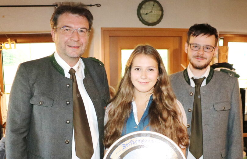 Bericht und Foto: Heinrich Rehberg – Christina Scheck ist mit dem besten Ergebnis aller Zeiten die Siegerin beim 15. Dorfkönigsschiessen der Königlich privilegierten Feuerschützengesellschaft (FSG) Hohenaschau. Bei der Siegerehrung in der Schiessstätte überreichte Schützenmeister Franz Kiesmüller junior (links) zusammen mit seinem Stellvertreter Alexander Thanhäuser der besten Schützin des Dorfes die Siegerscheibe 2024.