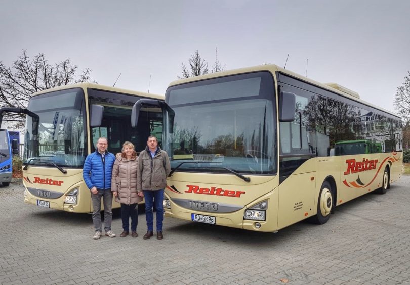 Die Reiter GmbH Rosenheim und Aschau i.Chiemgau investiert weiter in die Modernisierung seiner Busflotte. Mit der Anschaffung von zwei neuen Niederflurlinienbussen vom Typ Iveco Crossway werden zwei alte Busse abgelöst, die bisher neben den weiteren 10 Bussen in Stadt und Landkreis Rosenheim unterwegs waren. Ausgestattet sind die neuen Fahrzeuge mit Euro 6 Motoren Stufe D, die die derzeit strengsten Abgasnormen bei Dieselfahrzeugen erfüllen. Die Busse bieten den Fahrgästen mehr Komfort im Innenraum und mit 45 Sitz- und 30 Stehplätzen reichlich Platz. Eine moderne Klimatechnik sorgen für angenehme Temperaturen im Fahrgastraum und die Sicherheitsgurte an allen Sitzen für optimale Sicherheit aller Fahrgäste. Die Multifunktionsfläche für Rollstuhlfahrer und Kinderwagen wurde im Vergleich zu bereits vorhandenen Busmodellen vergrößert und durch eine Absenkvorrichtung ausgestattet. Weitere extra ausgerichtete Sitze für mobilitätseingeschränkte Fahrgäste sowie die mit Brailleschrift ausgestatteten Haltewunschtasten sorgen für ein unbeschwertes Fahren für alle Personengruppen. Die beiden neuen Busse kommen ab sofort im täglichen Linienverkehr zum Einsatz. Firmenchef Gerhard Reiter (rechts) freute sich zusammen mit seiner Lebensgefährtin Petra Schmidtchen und Cousin Claus Reiter (links) die neuen Fahrzeuge im Werk direkt in Empfang zu nehmen. „Mit der Neuanschaffung dieser neuen Busse wollen wir weiter im ÖPNV investieren und ein Zeichen im Klima- und Umweltschutz damit setzen“, so Gerhard Reiter.