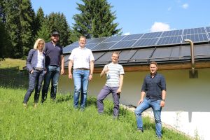 Die vier Hochbehälter des Aschauer Wasserwerks wurden mit Photovoltaikanlagen zur Stromgewinnung für den Betrieb der Pumpen ausgestattet. Bürgermeister Simon Frank ließ sich in Mitterleiten in die neue Anlage auf dem Dach des Hochbehälters einweisen. Cornelia Kallhardt, Dominik Schreiber von der ausführenden Firma Abel ReTec, Bürgermeister Simon Frank, der Energiebeauftragte der Gemeinde Aschau David Schmidtner, der Wassermeister der Gemeinde Peter Graf (von links)