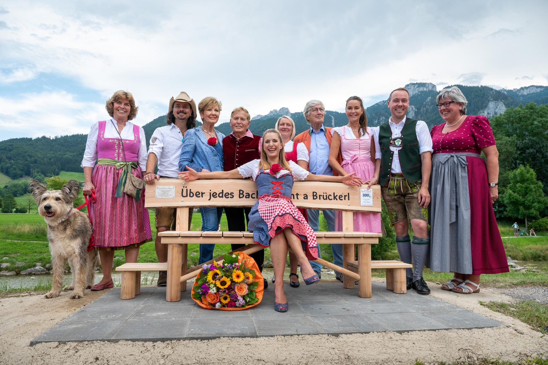 Wer braucht schon den Walk of Fame, wenn er ein Bankerl in Aschau i.Chiemgau haben kann?, scherzt Volksmusikstar Stefanie Hertel (Mitte). Die Sängerin stiftet dem Bankerldorf Aschau i.Chiemgau eine neue Sitzgelegenheit und feierte die Einweihung u. a. mit Christa Clarin, Ehemann Lanny, Moderatorin Carolin Reiber, ihrem Papa Eberhard, der Schreinermeisterin Petra Huber, Schauspieler Christan Wolff, Sylvia Grüsser, Tourismus-Chef Herbert Reiter und Aschaus Dritte Bürgermeisterin Monika Schmid (von links).