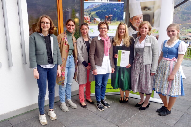 Bei der Übergabe der Urkunde im Auftrag des Bayerischen Landwirtschaftsministeriums betonte Irmgard Reischl vom Ebersberger Amt die vier Säulen, auf denen eine gesunde Ernährung beruht, es sind dies die Gesundheit, die Ökologie (Regionalität, Saisonalität und Bio), die Ökonomie (Bezahlbarkeit) und die Wertschätzung. Sie dankte dabei mit einem Zitat von Henry Ford, der die Voraussetzungen für einen gemeinschaftlichen Erfolg wie folgt formulierte: „Zusammenkommen steht am Beginn, Zusammenbleiben ist der Fortschritt und Zusammenarbeit sichert den Erfolg“. Fachlich begleitet wurde das Projekt von der Wertschöpfungs-Managerin Verena Schlegel von der EPOS Bio Partner Süd GmbH. Sie informierte, dass der Anteil von bio-regionalen Produkten im ersten Quartal des heurigen Jahres gegenüber dem Vorjahr von einem Prozent auf acht Prozente gestiegen ist. Letztlich besteht das Essen aus der Klinikküche Sonnenbichl zu 15 Prozent aus biologischen und regionalen Lebensmitteln. Ehe sich im Beisein von Dritter Bürgermeisterin Monika Schmid und Tourist-Informations-Leiter Herbert Reiter ein intensiver Dialog mit herrlichem Blick auf Kampenwand und Schloss Hohenaschau in Kombination mit kulinarischen Köstlichkeiten der Lieferanten entwickelte, galt noch Nane Kopczyk ein herzliches „Vergelt´s Gott“. Als Praktikantin der Klinik widmete sie sich in besonderer Weise der Speisenkarten-Überprüfung. Eines der mit ihr erzielten Ergebnisse und Veränderungen war, dass Fleisch weniger und Hülsenfrüchte mehr wurden. Ein Auge wurde auch darauf gerichtet, wie kindergerecht die Mahlzeiten zusammengesetzt wurden.