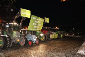 Vor der Halle hatten die Landwirte einige Bulldog mit mahnenden Spruchbändern für die Politiker aufgefahren.