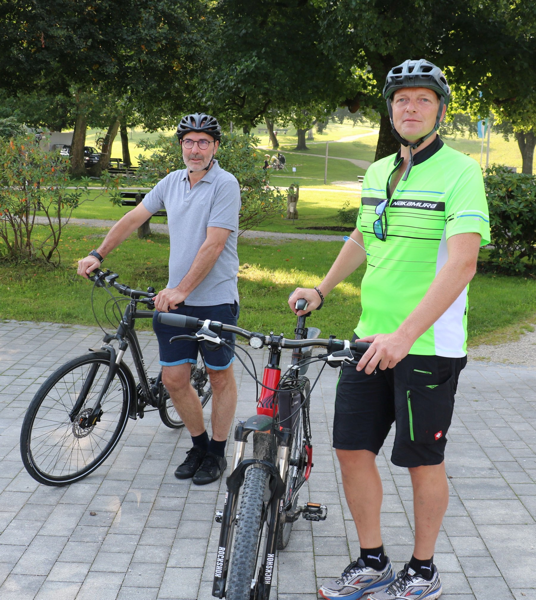 Zwei Dutzend Radlfahrer – an ihrer Spitze Aschaus Bürgermeister Simon Frank (rechts) und Bernaus zweiter Bürgermeister Gerhard Jell (links) – trafen sich in Bernau vor dem Rathaus, um gemeinsam nach Aschau zu radeln.