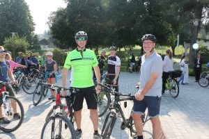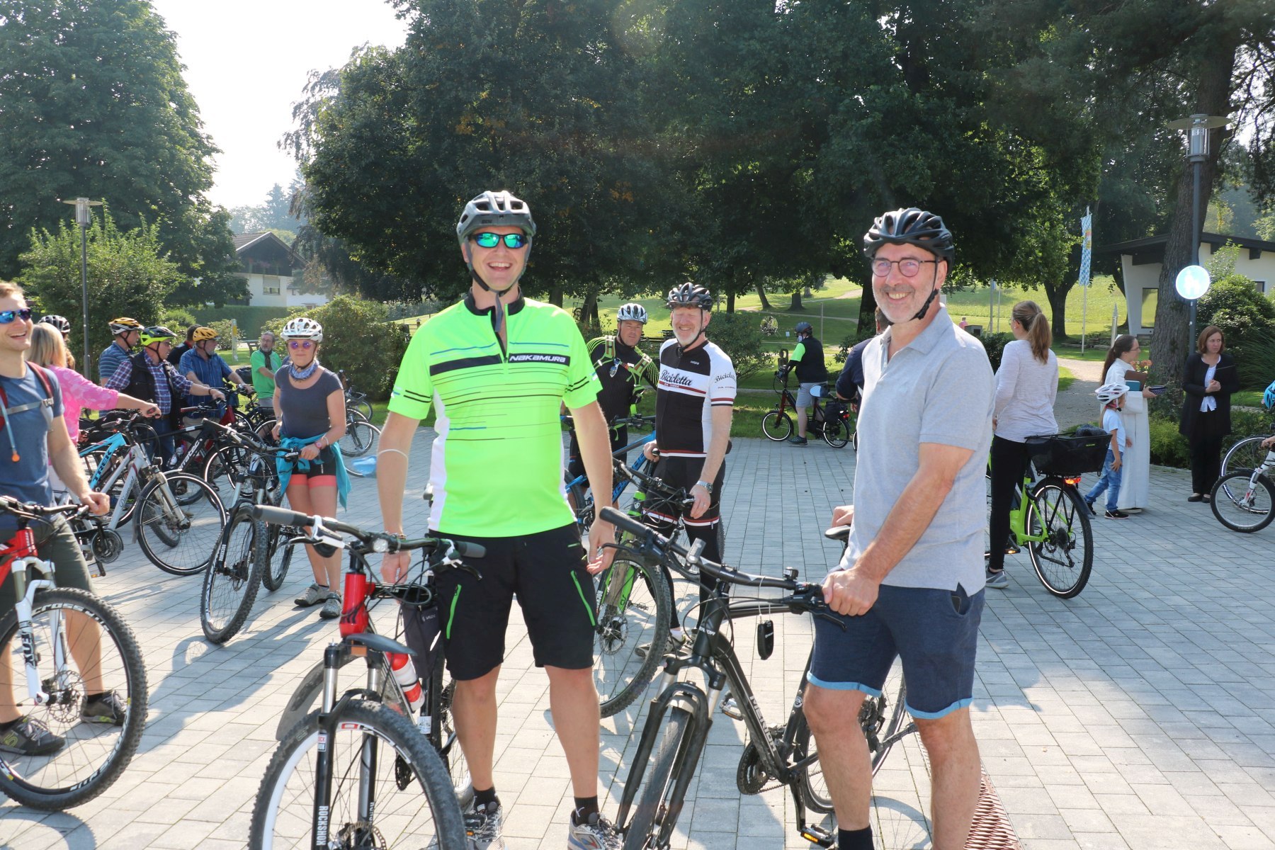 Zwei Dutzend Radlfahrer – an ihrer Spitze Aschaus Bürgermeister Simon Frank (links) und Bernaus zweiter Bürgermeister Gerhard Jell (rechts) – trafen sich in Bernau vor dem Rathaus, um gemeinsam nach Aschau zu radeln.