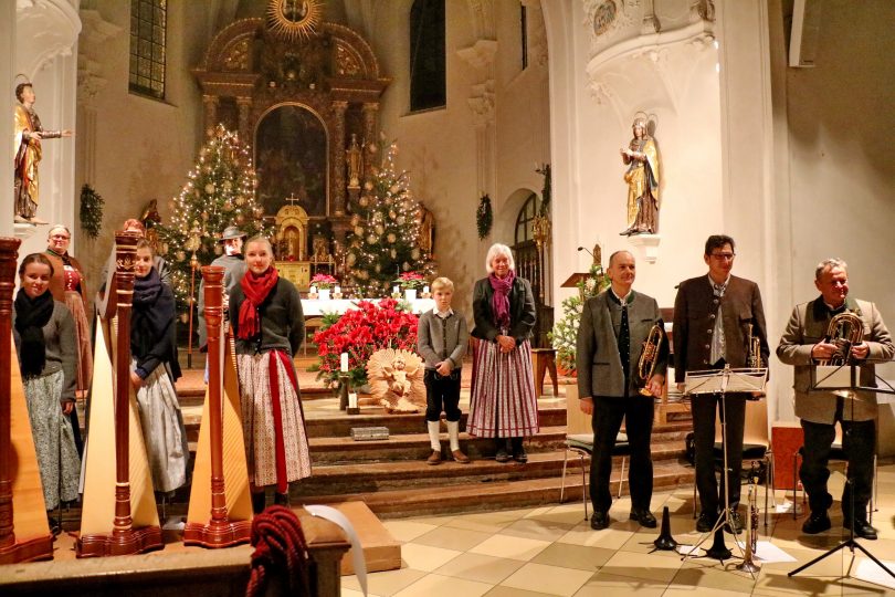 Agnes Staber als Maria und Andreas Schäffer als Josef brachten das Jesuskind zur Krippe und erinnerten mit ihrem Lied damit noch einmal an das Geschehen der heiligen Nacht. Drei Harfenengel – Maria aus Bernau, Franziska aus Hinterwössen und Lena aus Unterwössen – die sich als Trio „Seewind Harfendirndl“ nennen, spielten auf dem aerarischen Instrument. Federleicht und doch kraftvoll strichen sie über die Saiten ihrer Instrumente und weckten mit ihren Klängen in der dunklen Kirche Erinnerungen an das Spiel der Engel im Stall von Bethlehem. Die drei Schwarzensteiner Sängerinnen Gabi Reiserer, Anneliese und Agnes Staber sind in Aschau eine feste Größe eines jeden Singens. Sie bereicherten den Abend durch ihre vortreffliche Liedauswahl und ihren exzellenten Gesang aus ihrem reichhaltigen Repertoire geistlicher und weltlicher Volksmusik. Dabei spannten sie den Bogen von der Zeit der Geburt Christi unter Kaisers Augustus über Neujahr bis hin zu den heiligen drei Königen.