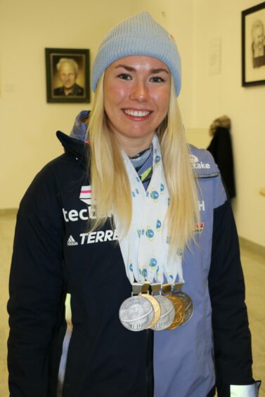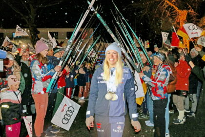 Die frischgebackene Junioren-Doppelweltmeisterin Julia Kink mit ihren fünf Medaillen. Die Kinder und Jugendlichen des Heimatvereins WSV Aschau standen Spalier für „ihre Julia.
