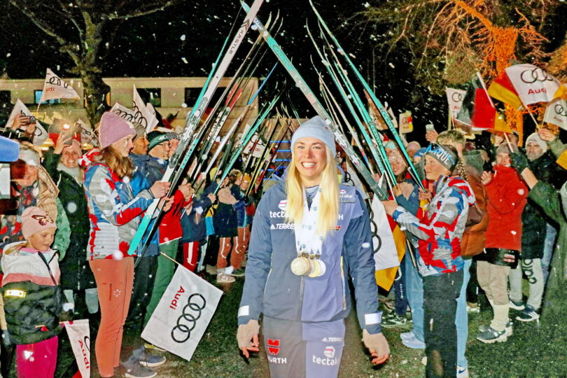 Ganz Aschau war zum Empfang der Doppelweltmeisterin und fünffachen Medaillengewinnerin Julia Kink auf dem Platz am Rathaus versammelt. Die Kinder und Jugendlichen des Heimatvereins WSV Aschau standen Spalier für „ihre Julia“, die bei den Biathlon Juniorenweltmeisterschaften in Schtschutschinsk (Kasachstan) gleich fünfmal den Sprung aufs Treppchen schaffte und dabei zweimal Gold und dreimal Silber für Deutschland holte.