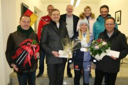Empfang im Aschauer Rathaus – Erste Reihe: Tourismuschef Aschau Herbert Reiter, Bürgermeister Simon Frank, Aschau, Junioren-Doppelweltmeisterin Julia Kink, Bürgermeister Daniel Mair, Frasdorf Zweite Reihe: WSV Vorsitzender Tobias Prankl, zweiter Bürgermeister Michael Andrelang, Tourismusleiterin Heike Stettner, Frasdorf, Markus Meister, der Abteilungsleiter der Nordischen Abteilung im WSV