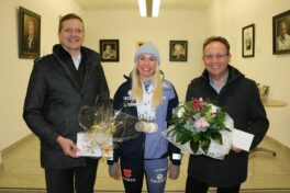 Empfang im Aschauer Rathaus – Bürgermeister Simon Frank aus Aschau (links) und Bürgermeister Daniel Mair aus Frasdorf (rechts) gratulieren der frischgebackenen Junioren-Doppelweltmeisterin Julia Kink