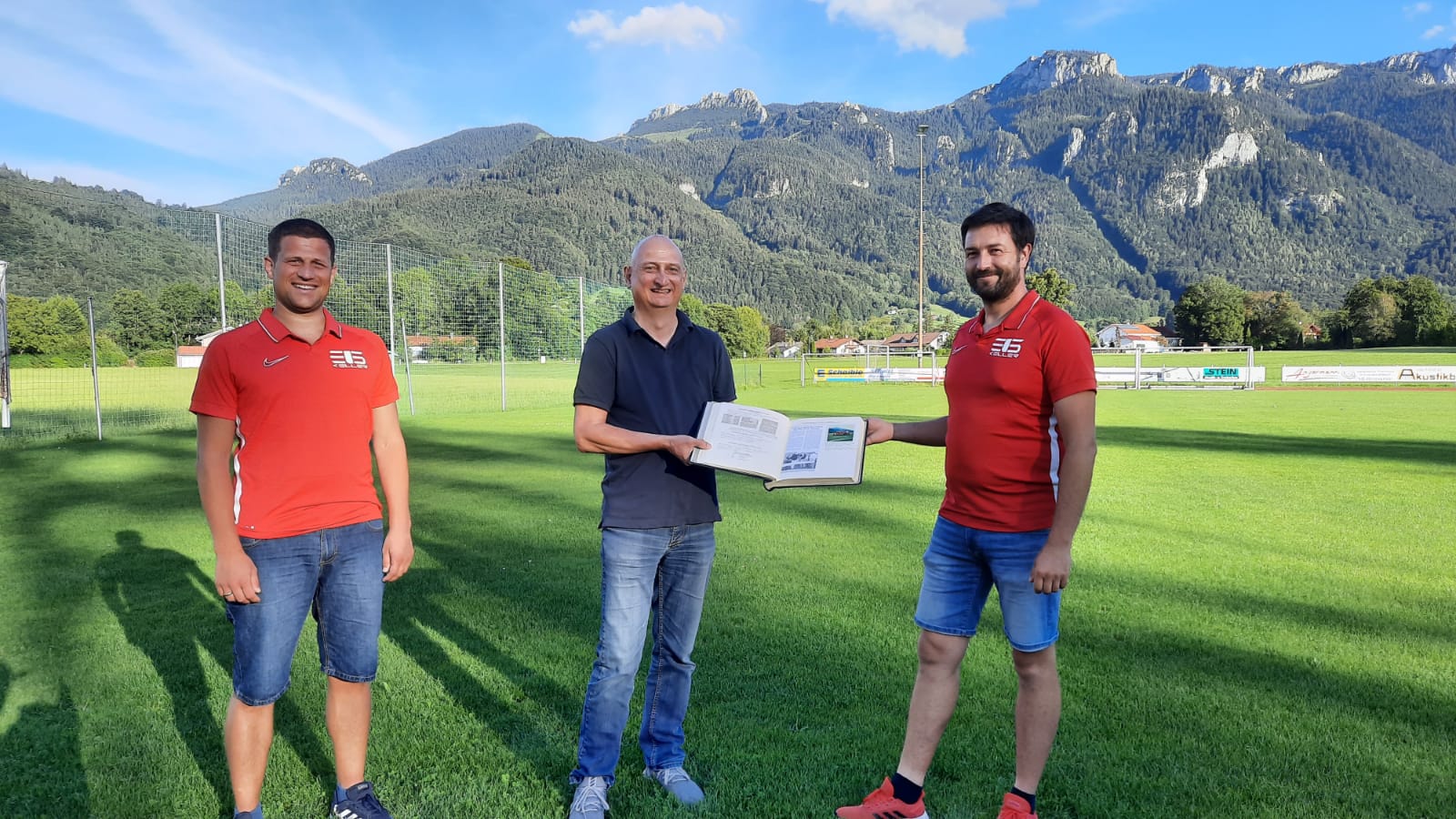 Wolfgang Daxwanger (Mitte) übergab elf vollgeschriebene Bände Aschauer Fußballchronik aus den letzten 56 Jahren an die Abteilungsleiter Fußball beim WSV Aschau. Von links: Peter Feistl (Abteilungsleitung WSV Aschau), Wolfgang Daxwanger, Nico Altmann (Abteilungsleitung)