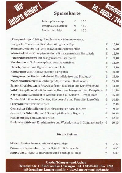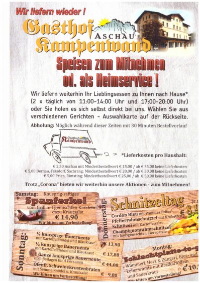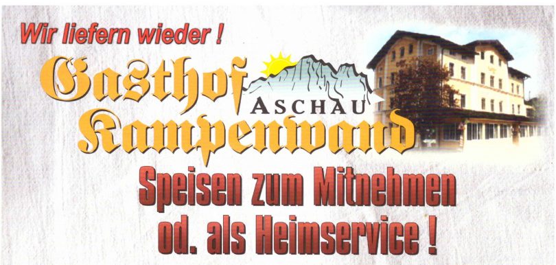 Beim Gasthof “Kampenwand” gehen auch in Corona-Zeiten die Sonderaktionen weiter – wie zum Beispiel samstags Spanferkel-Essen, Sonntags gibt es Bauernente und ofenfrischen Schweinekrustenbraten, Montags ist Schlachtplatte to go und donnerstags heißt es Schnitzeltag. Alle Speisen gibt es zum Mitnehmen oder als Heimservice zweimal täglich von 11 Uhr bis 14 Uhr sowie von 17 Uhr bis 20 Uhr. Bestellungen werden unter der Telefon-Nummer 08052-2440 entgegengenommen.