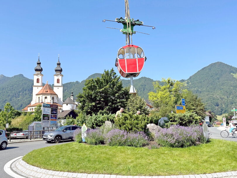 Seit Jahren ist er nicht nur ein Hingucker, sondern weitum bekannt als einer der schönsten Kreisverkehre weit und breit. Markant durch die rote Gondel der Kampenwandseilbahn zieht der Kreisel in Aschau i.Chiemgau die Blicke auf sich. Doch inzwischen ist die Farbenpracht ein wenig verblasst.