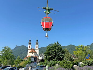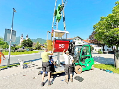 Um weiterhin ein strahlendes und perfektes Ortsbild abzugeben wurde nun die Gondel ausgehoben, damit diese von der Kampenwandseilbahn GmbH frisch lackiert wird. Regelrecht schwebend über der doppeltürmigen Katholischen Kirche „Darstellung des Herrn“, gab die Gondel am Dienstagvormittag ein beeindruckendes Bild ab. Aschaus Erster Bürgermeister Simon Frank bedankt sich bei der Kampenwandseilbahn und freut sich, dass die knallrote Gondel pünktlich zum Gaufest Ende Juli 2024 wieder in neuem Glanz erstrahlt, die Ortsmitte verschönert und Einheimischen und Gästen den Weg zu einem der Wahrzeichen Aschaus, der Kampenwand, weist.