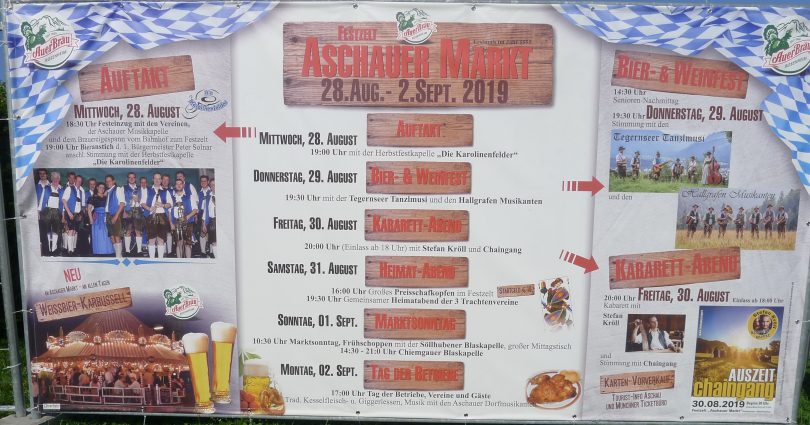 Der traditionsreiche Aschauer Markt findet heuer am Sonntag, 1. September statt. Vor und nach dem Haupttag gibt es ein umfangreiches Festzeltprogramm, das am Mittwoch, 28. August mit einem Festzug ab 18 Uhr vom Hans-Clarin-Platz aus beginnt. Um 19 Uhr wird Bürgermeister Peter Solnar das erste Faß von Auerbräu Rosenheim anzapfen, alsdann spielen die Karolinenfelder Blasmusikanten auf. Das Fest, das von der Familie Heinrichsberger veranstaltet wird, dauert bis Montag, 2. September.