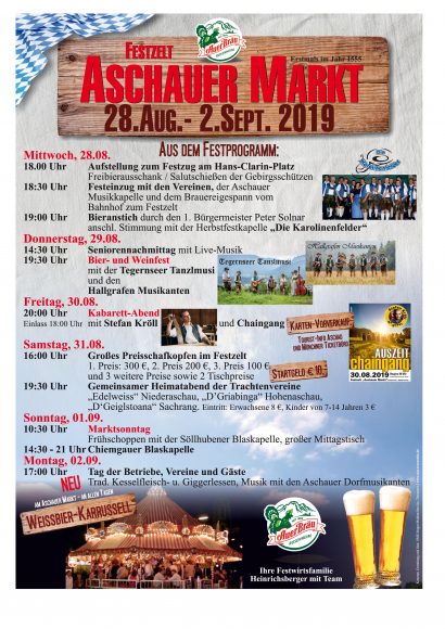 In diesem Jahr beginnen die Veranstaltungen rund um den Aschauer Markt am Mittwoch, 28. August mit dem Festeinzug. Die Aufstellung des Zuges mit der Aschauer Musikkapelle, den Brauereigespannen und den Fahnenabordnungen der Vereine ist um 18.30 Uhr am Hans-Clarin-Platz. Der Zug führt über die Schul- und Schützenstraße zum Festzelt, hier zapft Bürgermeister Peter Solnar gegen 19 Uhr das erste Fass an. Am Donnerstag, 29. August beginnt um 14.30 Uhr der Seniorennachmittag im Festzelt, danach trifft man sich um 19.30 Uhr zum Bier- und Weinfest mit der Tegernseer Tanzlmusi und den Hallgrafen Musikanten. Am Freitag, 30 August kommen Stefan Kröll & Chaingang zum Kabarett Abend ins Festzelt, Einlass ab 18 Uhr, der Beginn ist um 20 Uhr.