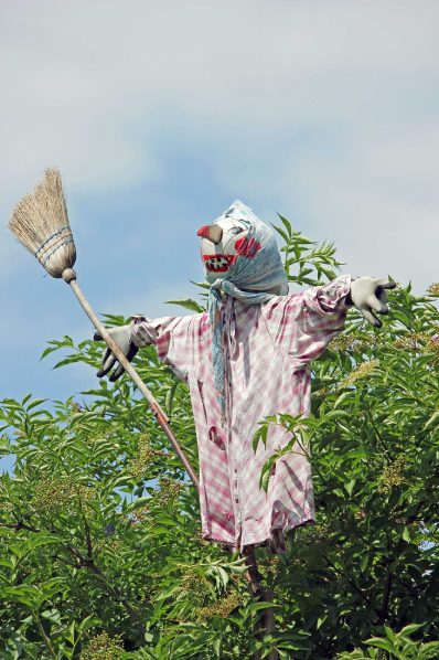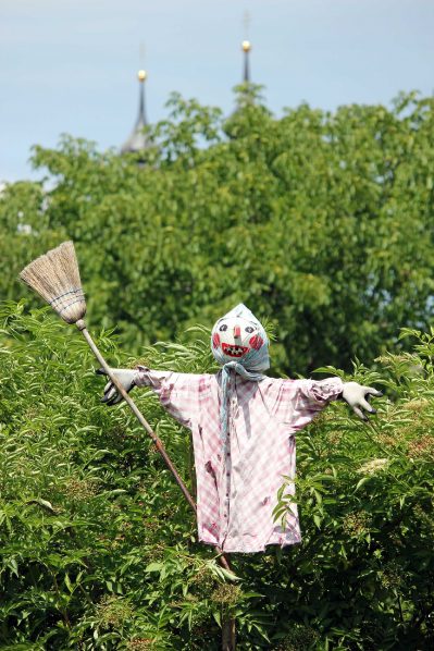 In luftiger Höher einen treuen Dienst leisten und dabei dem Federvieh regelrecht etwas vorgaukeln, ja das ist eine Vogelscheuche. Mit viel Liebe wurde diese menschenähnliche Figur aus Holzstangen, alten, abgetragenen und zerfetzten Kleidungsstücken und einem Lederfußball zusammengebastelt. Durch ihre Silhouette und Bewegungen im Wind werden derzeit die Früchte von Kirschen oder wie hier die Hollerbeeren beschützt. Hinzukommt, dass wie diese kreative Gestalt in einem Privatgarten in Aschau i.Chiemgau, es noch dazu ein Blickfang für den menschlichen Betrachter ist.