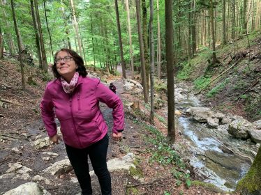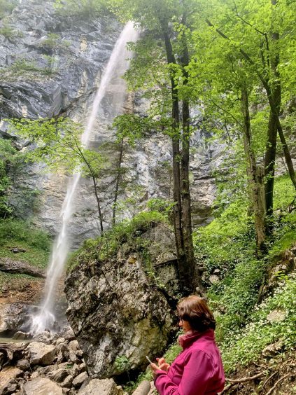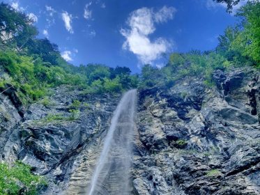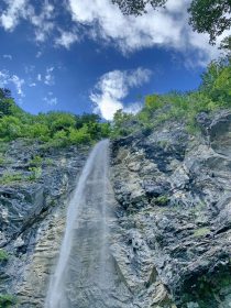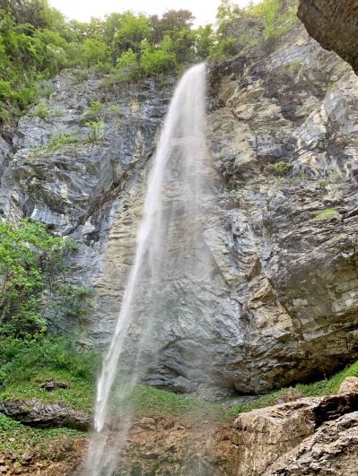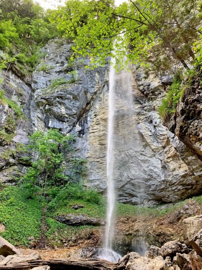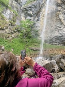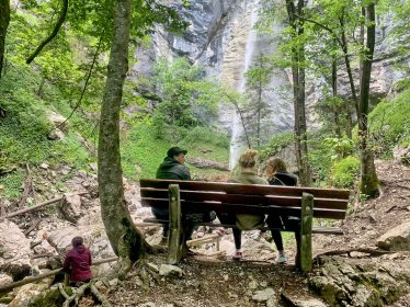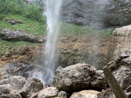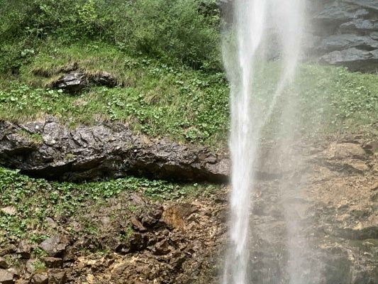 Viele Gedanken gehen einem durch den Kopf, wenn man zu Füßen des Wasserfalls in Schossrinn zwischen Aschau und Sachrang den Blick empor richtet. Dabei scheint es, dass aus einem weiß-blauen Himmelsloch das Wasser hervorkommt und rund 90 Meter in die Tiefe stürzt. Am Boden lautstark angekommen entwickelt sich das Gewässer zu einem ruhigen, zahmen kleinen Bach, der im Flüsschen Prien mündet und dann seinen Weg zum Chiemsee sucht. Der Name kommt vermutlich daher, dass das Wasser vom Felsen herunter geschossen kommt und danach weiter rinnt. Der Wasserfall “Schoßrinn” gilt bei Einheimischen als Frauenkraftplatz und wird von vielen Frauen gerne aufgesucht, um innezuhalten und aufzutanken.