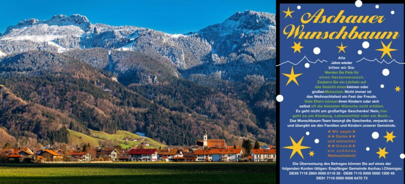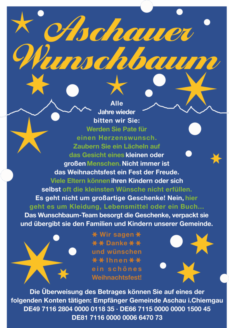Auch in diesem Jahr gibt es wieder die Aktion „Aschauer Wunschbaum“. Wie bereits in den letzten Jahren wurden Familien, Kinder und alle anderen Bürger der Gemeinde Aschau i.Chiemgau mit geringem Einkommen eingeladen, einen Weihnachtswunsch bei uns zu äußern. Die Wünsche haben uns auch schon erreicht und warten nun auf Ihre Erfüllung.