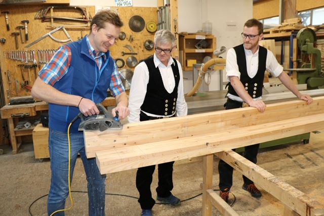 So musste der regierende Bürgermeister von Aschau, Simon Frank, als Ausgleich einen Tag in der Zimmerei Wörndl in Eggstätt-Natzing mithelfen, damit auch hier alles seinen geregelten Gang geht und der Prinz in den letzten tollen Tage frei bekommen kann. „Immer diese Sofortentscheidungen, Hobel oder Schleifer, Spax, Schrauben oder Nägel“ stöhnte das Gemeindeoberhaupt in der Werkstatt, „und niemand ist dabei, der mir die Entscheidung vorbereitet, kein Vorzimmer und keine Verwaltung“. In der 50-jährigen Geschichte des Aschauer Faschings ist es eine gut gepflegte Tradition, dass der Aschauer Bürgermeister den Faschingsprinzen einen Tag an seinem Arbeitsplatz besucht, sich über die anfallenden Arbeiten informiert und – soweit möglich – mitarbeitet.