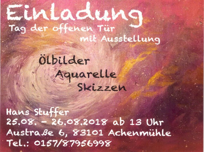 Der Maler Hans Stuffer aus Achenmühle lädt in sein Haus in der Austraße 6 am Samstag, 25. August und am Sonntag, 26. August jeweils ab 13 Uhr zu einem Tag der offenen Tür ein. Ausgestellt werden dabei Ölbilder, Aquarelle und Skizzen. Der Eintritt ist frei, nähere Informationen gibt es unter 0157-8756998.