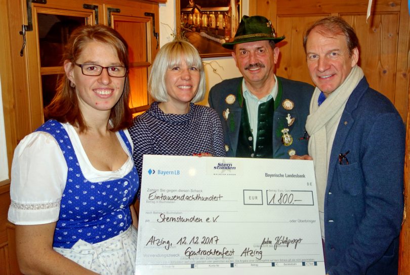Das Gautrachtenfest des Chiemgau-Alpenverbandes, das im Sommer in Prien-Atzing stattfand hat in diesen winterlichen Tagen noch einen guten Zweck erfüllt. Im Rahmen einer guten Zusammenarbeit mit dem Bayerischen Rundfunk stellten die Atzinger Trachtler aus ihren Veranstaltungen mit weiteren Unterstützern die Summe von 1.800 Euro für die Benefizaktion „Sternstunden“ des Bayerischen Rundfunks zur Verfügung. Bei einer Übergabe der Spende bedankte sich Geschäftsführer Thomas Jansing für die wohltuende Tat. „Sternstunden hat in den letzten 24 Jahren mehr als 2.850 Kinderhilfsprojekte unterstützt – davon über die Hälfte in Bayern. Die gesamte Spende kommt ohne Abzüge bedürftigen Kindern zugute.“!“, so Thomas Jansing (re.), der zusammen mit seiner Mitarbeiterin Christine Eberle den Scheck von Kassierin Christine Langmann (li.) und von Anton Hötzelsperger von der Vorstandschaft des Atzinger Trachtenvereins entgegennahm.