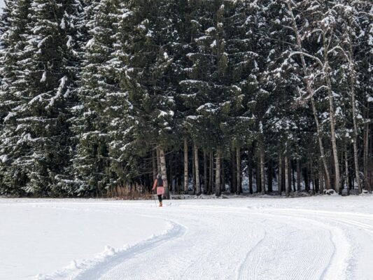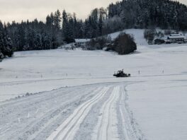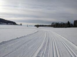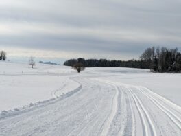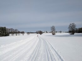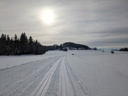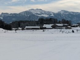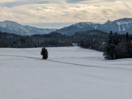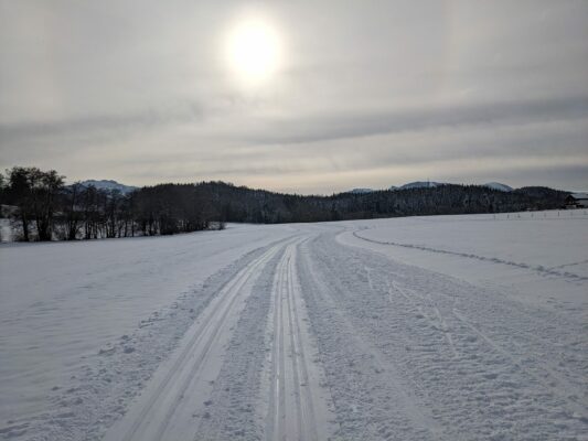 Immer noch ganz in Ordnung sind derzeit die Langlaufmöglichkeiten auf der Loipe in Atzing. Die wunderschöne Loipe unweit von Prien ist heute frisch gespurt und ganz gut zu laufen. Die Schneedecke ist allerdings recht dünn und an einigen Stellen schaut schon ein wenig das Gras heraus. Bei den Abfahrten war daher erhöhte Vorsicht geboten!