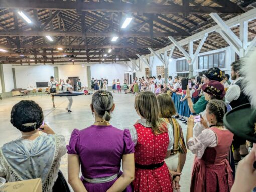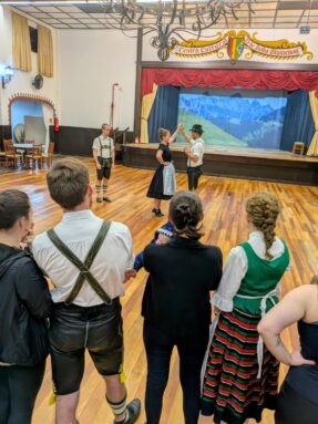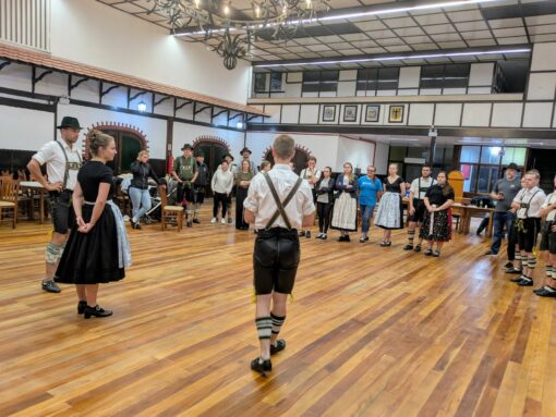 Ein großer Unterschied zur Atzinger Gruppe besteht bisher darin, dass das Preisplatteln in Blumenau ohne Dirndl stattfindet – es gibt weder einen Dirndlrahn-Wettbewerb noch das Walzertanzen vor dem Platteln. Das soll sich in Zukunft ändern. Deshalb führte die Atzinger Gruppe unter großem Interesse der Blumenauer Volkstanzgruppe einen Tanz- und Dirndldreh-Workshop durch, bei dem die Atzinger Dirndl die Grundlagen des Dirndldrehens vermittelten und anschließend gemeinsam mit den Buam das Walzertanzen vor dem Platteln übten. „Der Workshop hat uns einen großen Schritt weitergebracht. Mit weiterem Üben und Austausch können wir bald genauso Dirndldrehen und Walzertanzen wie die Chiemgauer. Das Interesse der Frauen ist auf alle Fälle da“, so Laura Ziel. Ein Problem bleibt die Frauentracht: „In Brasilien gibt es bisher niemanden, der sie nach Chiemgauer Vorbild anfertigen könnte. Jede Unterstützung von Sachkundigen wäre willkommen“, ergänzt sie.
