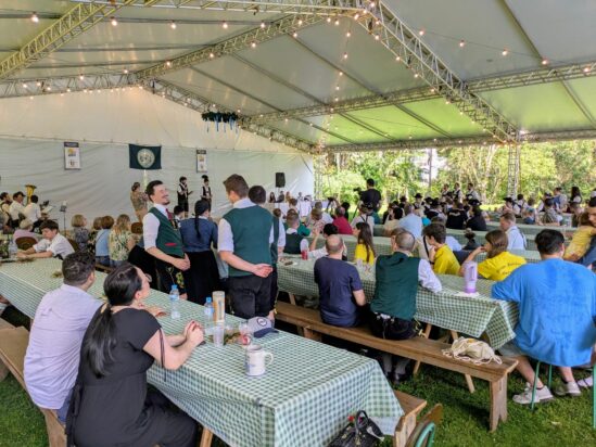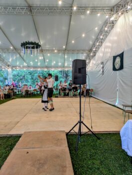 Im September reisten nun fünf Dirndl und sechs Buam aus den Reihen der Atzinger Aktiven im Alter zwischen 20 und 30 Jahren zum Gegenbesuch nach Brasilien. Nach Zwischenstationen in Rio de Janeiro und Foz de Iguaçu wurden sie in Blumenau herzlich empfangen und in Gastfamilien untergebracht. Dort erwartete die Gruppe ein abwechslungsreiches Programm mit Ausflügen, Plattlerproben, einem Vereinsfest, einem Preisplatteln sowie einem Tanz- und Dirndldreh-Workshop. Beim offenem Preisplatteln, bei der neben den „Original“ Blumenauer sechs weitere brasilianische Vereine teilnahmen, waren die Atzinger Buam nicht nur Zuschauer, sondern traten selbst an – und gewannen in allen drei Disziplinen, in denen sie starteten. Dennoch zeigten sie sich beeindruckt: „Wir hätten nicht gedacht, dass in Blumenau so ernsthaft und sauber geplattelt wird. Wenn man ihren Ehrgeiz sieht, werden sie in ein paar Jahren viele von uns übertreffen. Auch dass sie den schwierigen Maxglaner-Marschplattler beherrschen, ist beeindruckend, das können bei uns nur wenige“, so Vorplattler und Sieger der Erwachsenengruppe Michael Schlosser.