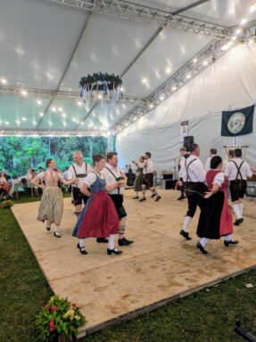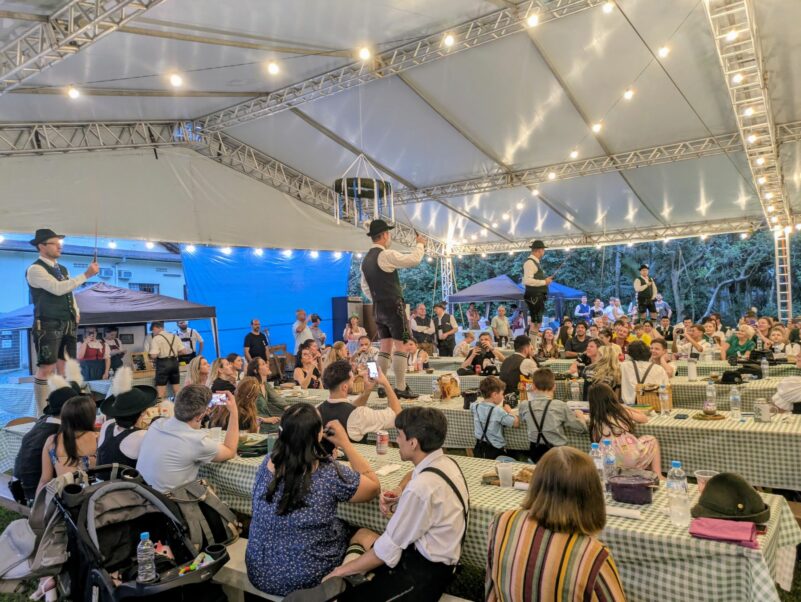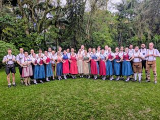 Seit vielen Jahren pflegt der Trachtenverein „Daxenwinkler“ Atzing aus der Gemeinde Prien am Chiemsee eine enge Freundschaft mit der Blumenauer Volkstanzgruppe und insbesondere mit ihrer Schuhplattler-Teilgruppe „Original Blumenauer“. Vor Kurzem reisten ein gutes Dutzend aktiver Mitglieder nach Blumenau, um die Verbundenheit weiter zu vertiefen und das Chiemgauer Trachtler-Brauchtum mit Platteln, Walzertanzen und Dirndldrehen – unter anderem bei einem Workshop – zu präsentieren.