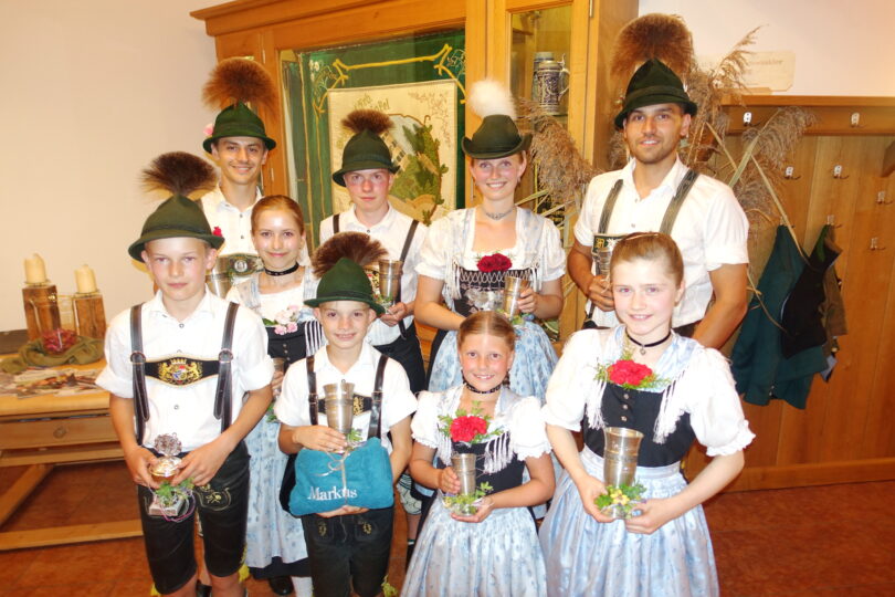 Voll besetzt von Mitwirkenden, Eltern, Großeltern und Vereinsmitgliedern war das Vereinshaus als die „Kranzerer-Buam“ aus Frasdorf mit den ersten Unterhaltungsweisen aufspielten. Alsdann bat Vorstand Konrad Huber die Preisrichter Lorenz Obermüller aus Prien, Peter Schäffer aus Frasdorf, Christian Lechner aus Höhenmoos und Christian Freund aus Atzing auf ihre Beobachtungsplätze und der Traditionswettbewerb konnte beginnen. Aufgrund von Punktgleichheit musste nur wenig „gerittert“ werden und so kamen folgende Ergebnisse zustande: Baum I: Erster Markus Kalal vor Vitus Kurz und Tobias Loferer. Dirndl I: Erste Sophie Meier vor Ida Kurz und Carina Kalal. Buam II: Erster Christian Huber vor Hansi Mayer und Lukas Feichtner. Dirndl II: Erste Julia Feichtner vor Marlene Mayer und Kathi Riepertinger. Buam III: Erster Benedikt Sälzer vor Alois Riepertinger und Maxi Schlosser. Dirndl III: Erste Franziska Sälzer vor Sophia Riepertinger und Leni Riepertinger. Aktive Buam: Michael Schlosser vor Wasti Jell und Andreas Schlosser. Aktive Dirndl: Anna Boggusch vor Antonia Baumert und Anna Hötzelsperger. Altersklasse: Erster Andreas Rauch vor Peter Hötzelsperger und Florian Röger. Beim Gruppenplatteln gewann nach einer Auslosung das Dirndl-Buam-Quartett „Sau“ vor „König“, „Ober“, „Unter“ und „Jugend“.