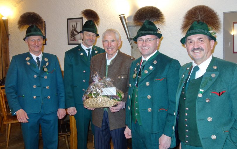 Zu seinem 75. Geburtstag bekam Michael Schlosser aus Prien-Stetten bei seiner Feier mit Familie, Verwandten, Nachbarn und Freunden auch Besuch vom Atzinger Trachtenverein „Daxenwinkler“. Bei der Zusammenkunft im Gasthaus Hirzinger in Söllhuben dankten (von links) Konrad Huber, Hans Rauch, Wilhelm Feichtner und Anton Hötzelsperger als Vertreter der Vorstandschaft ihrem Ehrenmitglied für dessen jahrzehntelangen Dienste als Aktiver, Fähnrich und Bau-Verantwortlicher des Atzinger Vereinshauses mit einem Geschenk-Gutschein und den besten Wünschen für die weitere Zukunft.