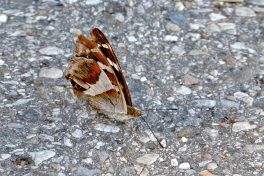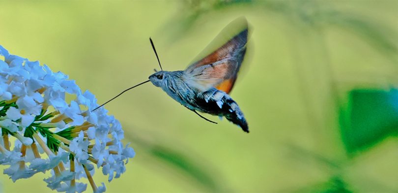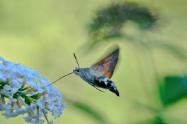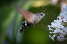 Auch im eigenen Garten kann man einiges entdecken, hilfreich dabei ist unter anderem ein Buddleia Strauch, aber auch andere Pflanzen locken Insekten an. Auf dem Buddleia Strauch schöpft ein Taubenschwänzchen Nektar, auf der Raukenblume labt sich ein Karstweißling, und auf der Minze sitzt eine Totenkopf Schwebefliege. Am Buddleia Strauch war nicht nur einen Taubenschwanz sondern auch einen C-Falter mit eingerollten Rüssel (proboscis). Der Schillerfalter nimmt gerne vom Gestein Mineralien auf, weshalb er nicht nur an Blumen, sondern auch auf der Strasse sitzt!