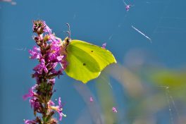 Der Stettener See hat auch im August einiges zu bieten. Vor oder nach dem Schwimmen kann man interessante Insekten beobachten. Der Große Blaupfeil landet gerne auf Menschen-Füße oder tanzt auf Grashalme. Die Tagpfauenauge-Raupen genießen den Brennessel. Dass es langsam herbstlich wird, merkt man am Hintergrund der Zitronenfalter, wo die ersten Spinnfäden die einzelnen Blütenblätter des Blutweiderichs abgefangen haben. Und den “Spinner” kann man ebenfalls beobachten – die Wespenspinne. Die Hauhechel-Bläulinge taumeln sich quicklebendig am Ufer, wobei sie auch Pausen für die Fotografin einlegen.