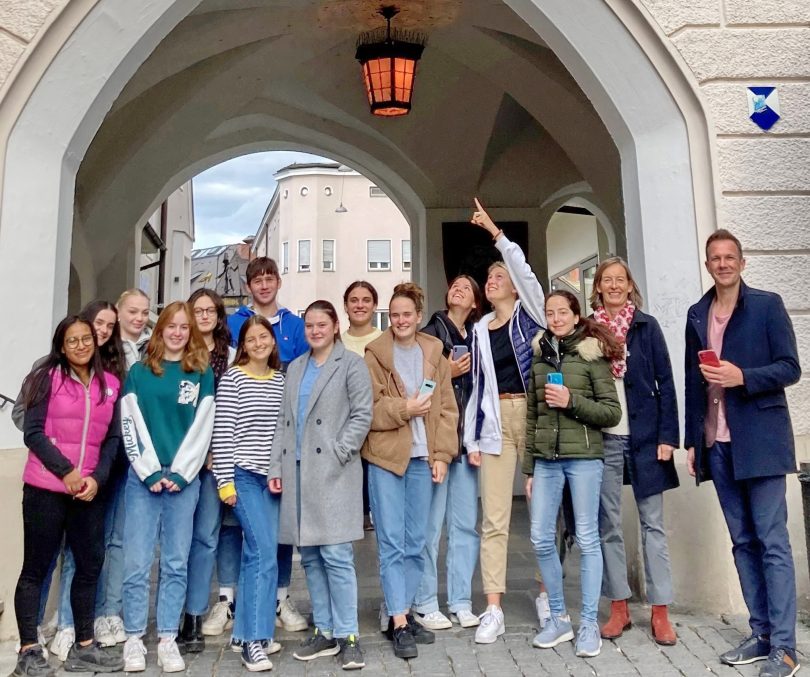 Stolz präsentieren die Schülerinnen und Schüler des Ignaz-Günther-Gymnasiums die Früchte ihres P-Seminars in der Rosenheimer Innenstadt: einen Audioguide, der französischsprechenden Besuchern Rosenheim die wichtigsten Sehenswürdigkeiten nahebringt.