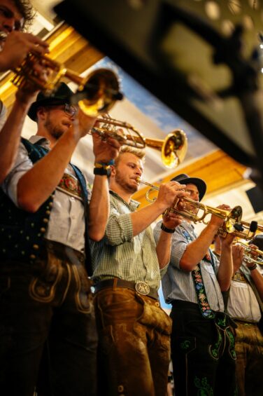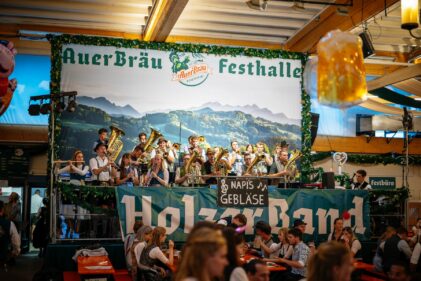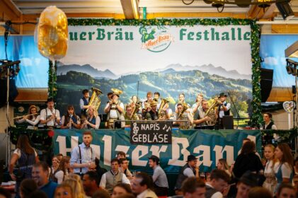 „Wuid, laud und schee!“, so war das Resümee der HolzerBand, die am vergangenen Sonntag am „Studenten Sonntag“ in der Auerbräu Festhalle ihren zweiten Auftritt bestritt. Bereits im letzten Jahr legten die Studenten, die aus verschiedensten Studienrichtungen kommen, aber gemeinsam die „HolzerBand“ formen, einen tosenden Auftritt vor einer vollen Festhalle hin. Das sollte in diesem Jahr wiederholt werden. Den Anfang machte die Bläserkombo „Nappis Gebläse“, danach spielte die HolzerBand ein buntes Repertoire aus Brass, Wiesnhits und Popsongs. Für die Studierenden eine einzigartige Möglichkeit, sich vor einem großen Publikum mitten auf der Wiesn zu präsentieren. Für die Gäste eine riesen Gaudi. Und so gingen an diesem Sonntag viele Gäste glücklich und erschöpft nach Hause.