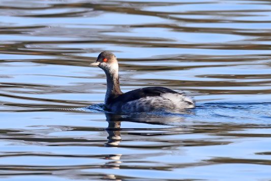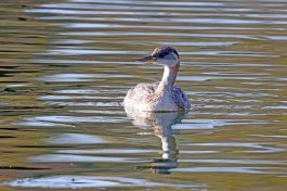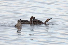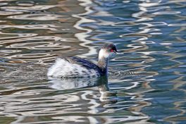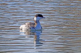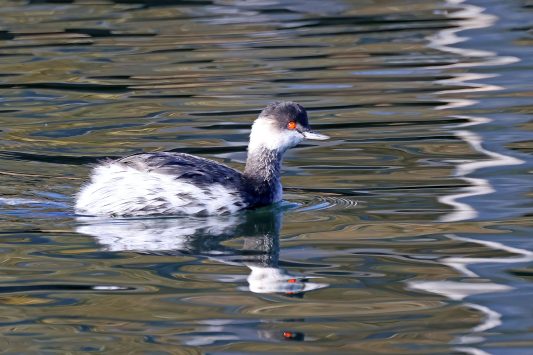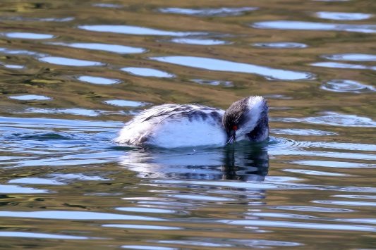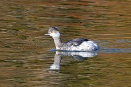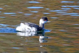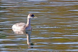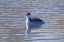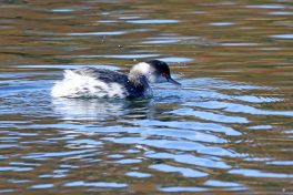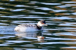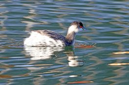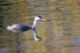 - Am westlichen Ende von Rimsting sind wieder Schwartzhalstaucher, Rothalstaucher und Ohrentaucher auf Nahrungssuche. Alle befinden sich noch im Schlichtkleid. Die Schatten der Bootshütten und Poller und Herbst und Sonnenschein ergeben interessante farbige Spiegelungen auf der Wasseroberfläche.