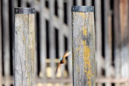 - Beim Weg vom Steg zurück setzt sich der Eisvogel auf einen Poller, ruht eine kurze Weile und macht dann die „Fliege“.