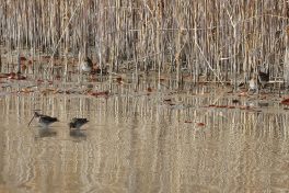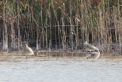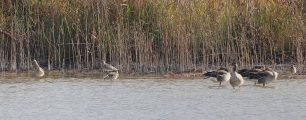 - Weitere Brachvögel halten sich nahe am Schilfrand auf, in deren Nähe auch viele Graugänse sich gruppieren.