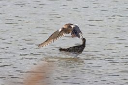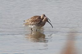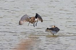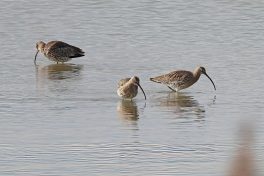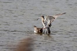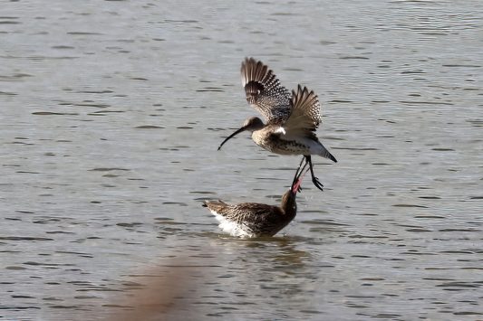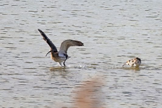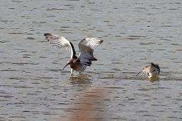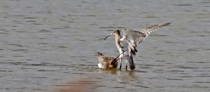 - In der Bucht scheint ein Brachvogel einem anderen zu Nahe gekommen zu sein – er scheucht ihn weg. Anschließend herrscht wieder Frieden und die Nahrungssuche wird gemeinsam fortgesetzt.