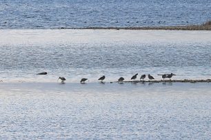 - Auch weiter draussen sind auf schmalen Landzungen Brachvögel zu sehen, die mit Gefiederpflege beschäftigt sind.