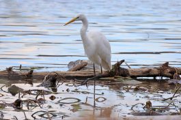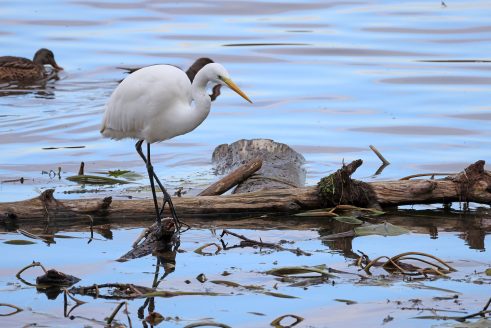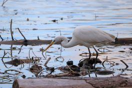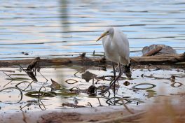 - Vor dem Turm versucht sich ein Silberreiher mit dem Fangen von Kleinstfischen. Sehr erfolgreich ist er nicht damit. Immer wieder wühlt er mit seinen Füssen vorsichtig den Boden auf. Ab und zu pickt er was auf, es ist aber so klein, dass ich es nicht erkennen kann.