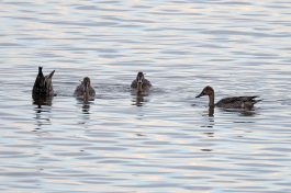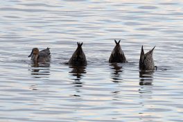 - Eine kleine Gruppe Spießenten gründelt vor dem Turm.