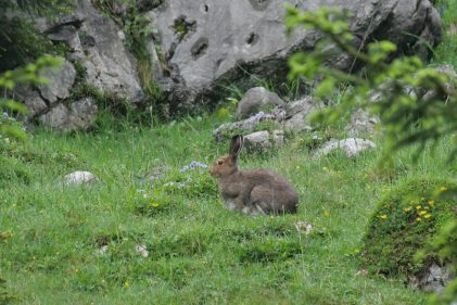 Am Wochenende war das Wetter am Vormittag noch ein wenig kühl, windig und neblig. Aber ein ideales Wetter um in den Bergen, im Laubensteingebiet bei Aschau i.Chiemgau, die Alpensalamander zu entdecken. Mehrer Exemplare waren unterwegs und den Schutz des Nebels nutzte offensichtlich der wenig ängstliche Angsthase (lepus timidus: Schneehase).