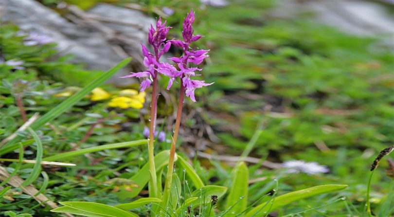 Auf den Bergwiesen blühen nun immer mehr Orchideen, etwa das Prächtige Knabenkraut. Dieses macht seinem Namen ja alle Ehre. Aber auch unscheinbare Vertreter wie die grüne Hohlzunge sind zu sehen.