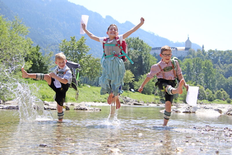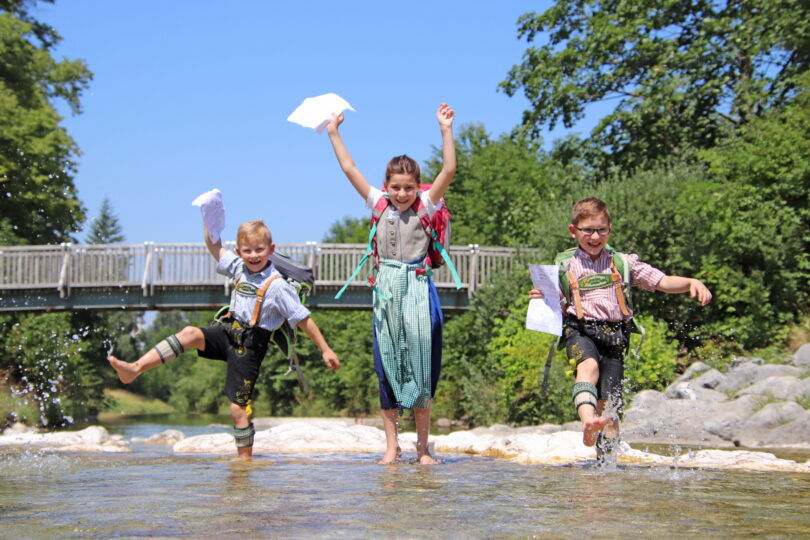 Auch diese drei Schüler aus Aschau im Chiemgau freuen sich riesig auf die schönste Zeit des Jahres: Magdalena Hendlmeier (Mitte) sowie die Brüder Hannes (links) und Sebastian Scholl (rechts) haben sich bereits mit ihren Zeugnissen im Flussbett der Prien im Ortskern von Aschau i.Chiemgau ein erstes Ferienvergnügen gegönnt. Wie wäre es mit einem Besuch in Aschau i.Chiemgau und im idyllischen Bergsteigerdorf Sachrang? Eine Besonderheit für Kinder sind die Entdecker-Kinderschnitzeljagden – voller Rätsel, Spaß und kleiner Belohnung. Erhältlich bei der Tourist Info Aschau, Tel. 08052/90490 und Tourist Info Bergsteigerdorf Sachrang, Tel. 08057/909737. Allen Kindern, Eltern und Urlaubshungrigen traumhaft schöne Ferientage.