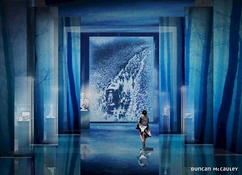 - Gestaltungseinblick in Abteilung 1 der Bayerischen Landesausstellung 2021 „Götterdämmerung II – Die letzten Monarchen“ – © Haus der Bayerischen Geschichte, Augsburg | Entwurf: Duncan McCauley, Berlin – Tausende Menschen nahmen am Begräbnis König Ludwigs II. teil. Sie waren erschüttert wegen der Begleitumstände dieses ungeklärten Todes. Ein Mythos beginnt.