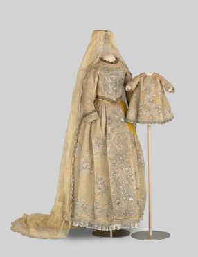 - Kleid der Ex-Königin Marie umgearbeitet für die Muttergottes mit Kind aus Kloster Wettenhausen m 1863 gemustertes Seidengewebe, Metallfäden, Pailletten, Silberfolie, Klöppelspitzen, Leinenspitzen, Gaze Kloster Wettenhausen © Haus der Bayerischen Geschichte | Foto: Philipp Mansmann – Um die Jahreswende 1862/63 hält sich Marie im Kloster St. Ursula in Augsburg auf. Vermutlich bringt sie dort ein außereheliches Kind zur Welt. Aus Dankbarkeit schenkt sie den Dominikanerinnen eines ihrer kostbaren Kleider. Sie arbeiten es zum Prachtgewand für ihre Marienstatue um.