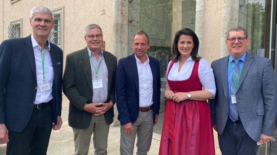 Kamen zum Auftakt des bayerischen Streuobstpaktes in Bamberg zusammen: Hermann Greif, BBV-Bezirkspräsident Oberfranken, Karl-Ludwig Rostock, Präsident des Bayerischen Erwerbsobstbau-Verbandes, Thorsten Glauber, Umweltminister, Michaela Kaniber, Landwirtschaftsministerin und Stefan Köhler, BBV-Bezirkspräsident Unterfranken (v.l.).